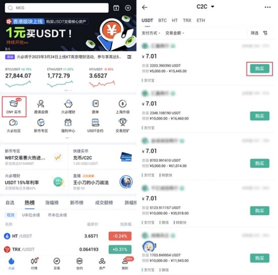 1、打开htx交易所APP并登录您的账户后,您会看到直观的首页界面。点击首页的【CNY买币】选项,系统将自动跳转到购买页面。以购买USDT为例,这是加密货币交易中常用的稳定币,选择它有助于降低波动风险。在商家列表中,浏览不同商家的报价和信誉评分,优先选择高评价的商家以确保交易可靠性。确认商家后,点击【购买】按钮,进入下一步操作。这一步骤仅需几秒钟,但请仔细核对商家信息,避免误操作。