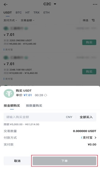 收款账户设置完成后,系统将自动返回到交易页面。输入您希望购买的金额,例如输入100元或更多,金额需符合商家设定的最小限额。选择适合您的付款方式,如支付宝,这是一种便捷的移动支付选项。确认所有信息无误后,点击【下单】按钮提交交易请求。系统会生成订单详情,包括交易金额、手续费和到账时间。下单后请及时完成付款操作,并在APP内查看订单状态。整个流程设计人性化,确保您在三分钟内完成交易。成功购买后,USDT将存入您的HTX钱包,方便后续交易或提现。