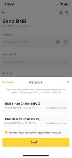 2、选择要提现的加密货币,此处以BNB为例。然后点击【通过加密货币网络发送】。在选择加密货币时,币安交易所app支持多种主流币种,如比特币、以太坊等;以BNB为例是因为它是币安平台的通用代币,交易速度快且手续费相对较低。点击通过加密货币网络发送后,系统会引导您进入地址填写环节,这一步骤需仔细核对币种类型,防止误选造成不必要的损失。用户应优先考虑网络兼容性和交易成本,确保资产转移顺畅。