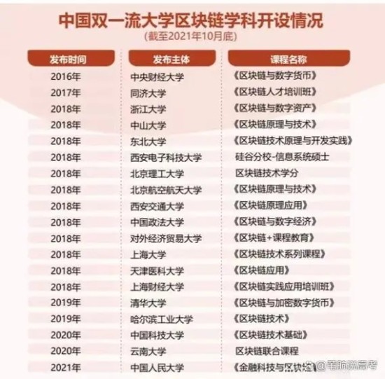 区块链的发展势头强劲。2021年3月,区块链被正式纳入《中华人民共和国国民经济和社会发展第十四个五年规划和2035年远景目标纲要》,强调加快技术创新和数字产业化进程,以打造数字经济新优势。国内教育领域也积极跟进,中央财经大学率先开设区块链相关课程,随后其他知名高校陆续引入选修内容。电子科技大学自2020年起招生计算机科学与技术专业(智能金融与区块链金融联合学位实验班),与西南财经大学合作培养专业人才。