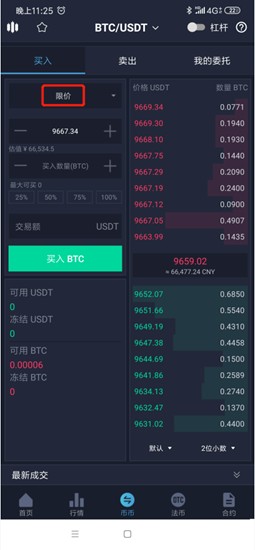 6.在交易页面,您需要根据个人需求选择交易方式:限价或市价。限价交易允许您自定义买入或卖出价格,系统会在市场价格达到设定值时自动成交。例如,当卖出挂单价格低于当前市价,或买入挂单价格高于市价时,交易会按市价执行。这种方式适合对价格波动有特定预期的用户。