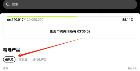 2、点击精选产品下面的低风险按钮。这个按钮专门筛选出低风险货币,系统基于实时数据分析,显示波动性较小、历史表现稳定的选项。用户应优先查看这里列出的货币,以减少潜在损失。