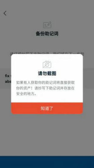 点击备份助记词后,系统会提示不要截屏。点击知道了进入下一步。