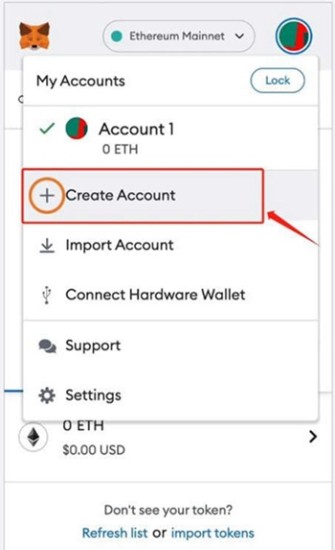 2、点击“创建账户”,按照创建的顺序恢复您的 Mask账户。在下拉菜单中找到“创建账户”按钮并点击,系统会提示您输入助记词或私钥。这些是您最初设置账户时生成的恢复信息,务必准确输入12个单词的助记词序列。输入完成后,点击确认进入下一步,这个过程会重建您的账户结构。确保在安全环境下操作,避免信息泄露。