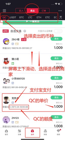 2、在OTC交易界面,浏览并选择您想要卖出的币种。操作流程简单易懂,这里以QC交易为例,说明如何卖出QC换取CNY。页面上会列出多个商家信息,包括价格和信誉,仔细查看后选择一个合适的商家,点击“卖出”按钮进入OTC卖出详情页。选择合适的商家能保障交易安全。