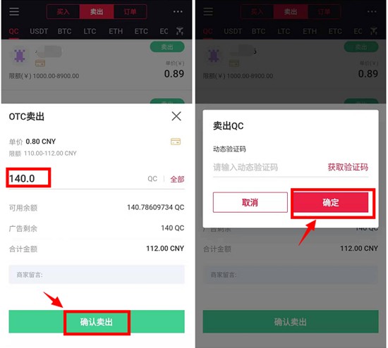 3、在卖出页面,输入您计划卖出的QC数量。确认输入无误后,点击“确认卖出”按钮。系统会要求您获取验证码,输入收到的验证码后点击“确定”。这一步成功创建卖出订单,建议核对数量避免错误。