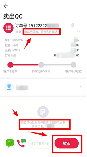 5、商家接单成功后,他们会根据您提供的支付宝、微信或银行账户进行转账。收到商家付款后,返回订单页面点击“放币”按钮。这一步需要您确认资金已到账再进行操作,避免不必要的风险。